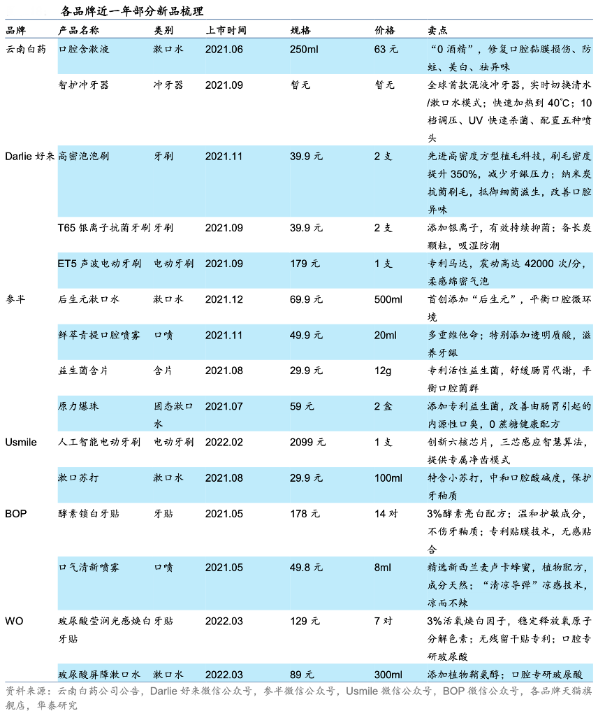 經(jīng)典案例:根據(jù)云南白藥公司公告、Darlie好來微信公眾號、參半微信公眾號、Usmile微信公眾號、BOP微信公眾號、各品牌天貓旗艦店、華泰研究等綜合資訊表明,成熟品牌探索新興領(lǐng)域,新銳品牌加速創(chuàng)新,云南白藥和好來化工(黑人牙膏母公司)作為傳統(tǒng)口腔護理企業(yè)的代表,都以其牙膏品牌廣為人知,如今它們也開始涉足更多新興品類,從淘寶旗艦店銷售品類來看,它們都上新了包括漱口水、電動牙刷、牙線在內(nèi)的口腔護理產(chǎn)品。