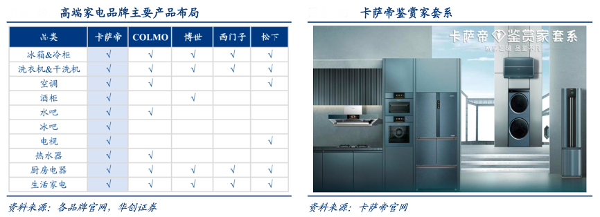 經(jīng)典案例:根據(jù)各品牌官網(wǎng)、卡薩帝官網(wǎng)、華創(chuàng)證券等綜合資訊表明,相較于其他高端品牌,卡薩帝不僅覆蓋了冰洗空等傳統(tǒng)家電產(chǎn)品,還擁有熱水器、廚電、酒柜等其他品類(lèi),是當(dāng)前國(guó)內(nèi)覆蓋品類(lèi)最全面的高端品牌。在此基礎(chǔ)上進(jìn)一步推出鑒賞家、指揮家等套系化產(chǎn)品系列,深挖用戶(hù)場(chǎng)景需求,成為國(guó)內(nèi)家電市場(chǎng)高端套系產(chǎn)品的首創(chuàng)者。