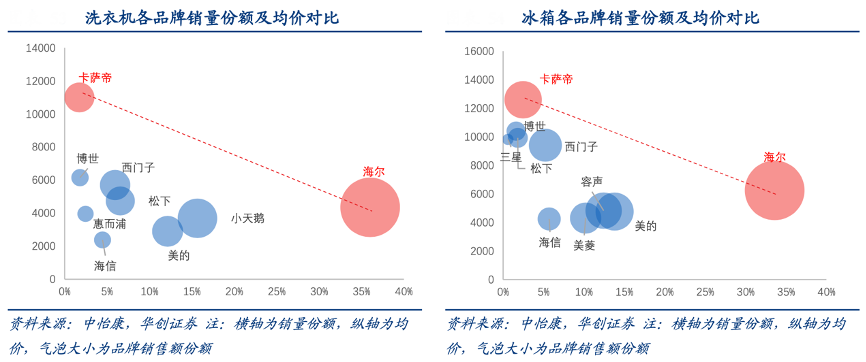 經(jīng)典案例:根據(jù)中怡康、華創(chuàng)證券等綜合資訊表明,卡薩帝與海爾主品牌已構(gòu)筑出獨(dú)占盈利與規(guī)模優(yōu)勢(shì)的共贏體系。以核心品類(lèi)冰箱、洗衣機(jī)為例,由海爾-卡薩帝建立的品牌組合體系構(gòu)成天花板,沒(méi)有任何品牌可以在同等價(jià)格下售出更高銷(xiāo)量,或者在售出同級(jí)別銷(xiāo)量的前提下達(dá)到更高均價(jià)。