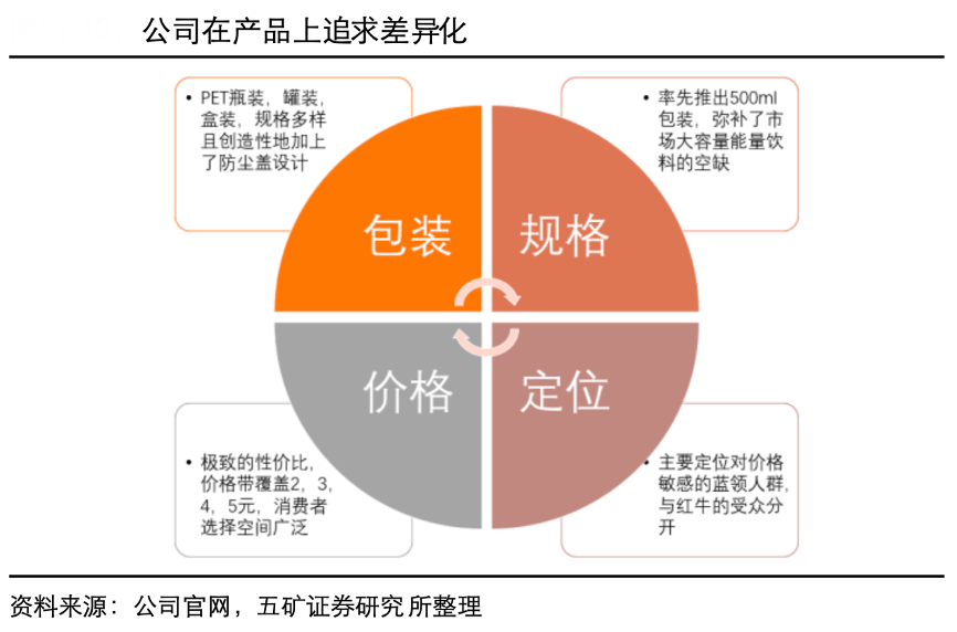 經(jīng)典案例:根據(jù)公司官網(wǎng)、五礦證券研究所等綜合資訊表明,為了迅速搶占市場,東鵬公司采用以價換量的策略在 2018 年將 250ml 金罐和 250ml 金瓶零售價分別從 5 元,3.5 元下調(diào)至 4 元和 3 元,形成了 2/3/4/5 元的產(chǎn)品矩陣。