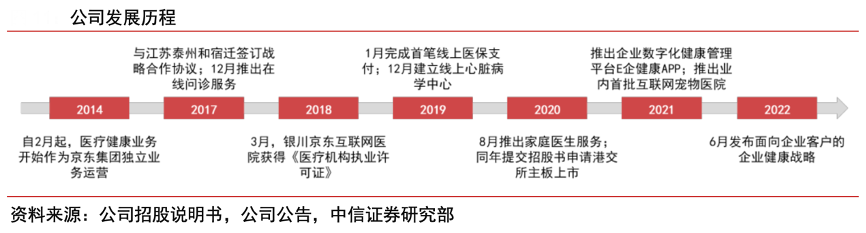 經典案例:根據公司招股說明書、公司公告、中信證券研究部等綜合資訊表明,京東健康是我國最大的在線醫(yī)療健康平臺與零售藥房,2014 年以來醫(yī)療健康作為京東集團獨立的類目進行運營;2016 年 5 月,“京東大藥房”上線, 標志著京東集團正式進入醫(yī)藥電商行業(yè);2018 年 11 月,京東健康注冊成為有限公司,并于 2020 年在港交所上市。