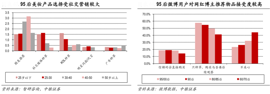 95后已經(jīng)成為國內(nèi)化妝品消費的主力人群,化妝品代際消費替換中。據(jù)中銀證券等綜合資訊顯示,從年齡分布上看,95年后出生的 Z 世代逐漸成為消費主 力,其美妝意識形成較早,對化妝品的品質(zhì)訴求較強,是化妝品消費最大潛力群體。根據(jù)阿里數(shù)據(jù)分析,95后在線上人均化妝品消費增速2018-2019年都是各代際里最高的,也是線上增速貢獻最大的群體。