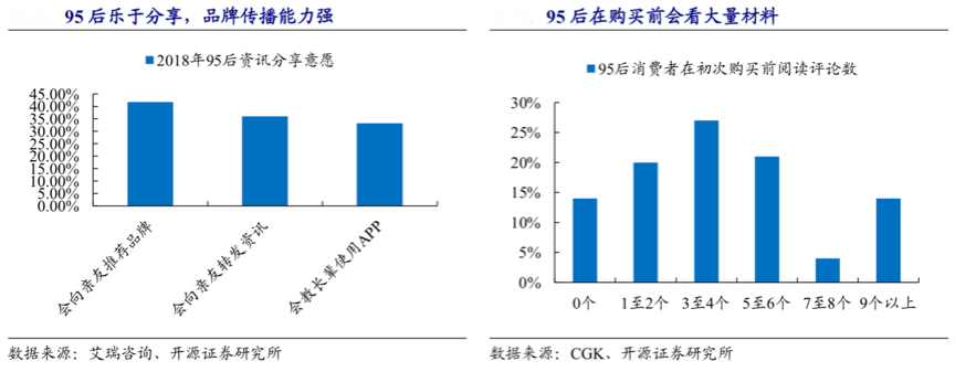 年輕一代的小電家消費,關(guān)注品牌,更關(guān)注內(nèi)容與交流特色,因愛好而形成圈子,“社群營銷”的現(xiàn)象日益突出。95后作為互聯(lián)網(wǎng)時代的原住民,其成長于社交媒體快速發(fā)展的環(huán)境下,具有較高的分享意愿。根據(jù)艾瑞咨詢、開源證券研究所等綜合資訊表明,41.8%的 95 后會向親友推薦好用的品牌,人群品牌傳播能力強。同時根據(jù)極光大數(shù)據(jù)報告,67.9%的 95 后表示商品的好評度會對自身的網(wǎng)絡(luò)購物產(chǎn)生影響,CGK數(shù)據(jù)則進一步顯示,66%的 95 后在初次購買前會閱讀 3 個以上評論。