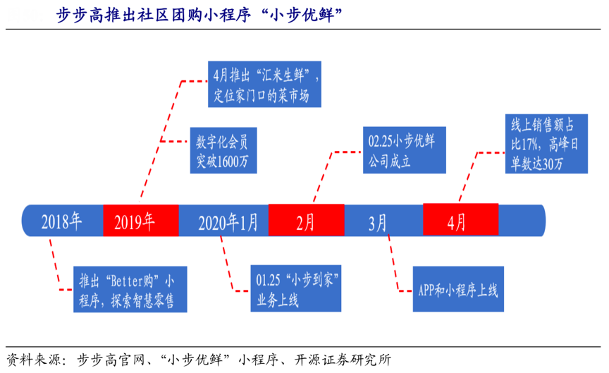 經(jīng)典案例:根據(jù)步步高官網(wǎng)、“小步優(yōu)鮮”小程序、開(kāi)源證券研究所等綜合資訊表明,2019年,步步高開(kāi)始數(shù) 字化轉(zhuǎn)型,“以用戶(hù)為中心”,加強(qiáng)以生鮮為核心的供應(yīng)鏈體系。2020 年 1 月 25 日,“小步到家”業(yè) 務(wù)正式上線(xiàn),將智慧零售觸角深入社區(qū)。2 月 25 日,全資子公司——湖南小步優(yōu)鮮 商業(yè)有限公司注冊(cè)成立,此后其推出社區(qū)團(tuán)購(gòu) APP 和小程序“小步優(yōu)鮮”,正式入局社區(qū)團(tuán) 購(gòu)市場(chǎng)的角逐。