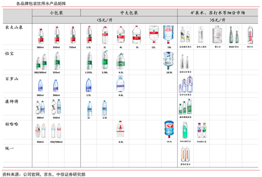 經(jīng)典案例:根據(jù)公司官網(wǎng)、京東及中信證券研究部等綜合資訊表明,農(nóng)夫山泉在包裝飲用水布局上兼具廣度和深度,一方面在包裝規(guī)模的設(shè)計(jì)上 SKU 最寬、最密,覆蓋各個(gè)消費(fèi)場景;另一方面推出差異化產(chǎn)品(嬰兒水和鋰水)和高端化產(chǎn)品(天然礦泉水的運(yùn)動(dòng)蓋裝和玻璃瓶)。在飲料布局上,其布局成長較快的細(xì)分賽道并持續(xù)深耕選中的品類,享受行業(yè)發(fā)展紅利。