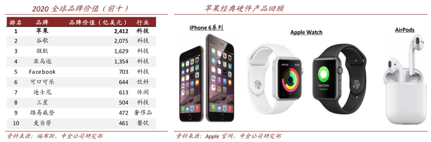 經(jīng)典案例:根據(jù)福布斯、中金公司研究部等綜合資訊表明, 2020 年蘋果品牌價(jià)值 2,412 億美元,超過谷歌、微軟、亞馬遜、Facebook 等科技龍頭公司,位居全球首位。2007-2019 年間,蘋果陸續(xù)推出 iPhone,iPad,Apple Watch,AirPods 等多款經(jīng)典的創(chuàng)新硬件,不僅打造了以 iPhone 為核心的智能硬件生態(tài),同時(shí)持續(xù)產(chǎn)品品類,打開了市場對可穿戴設(shè)備的想象空間。