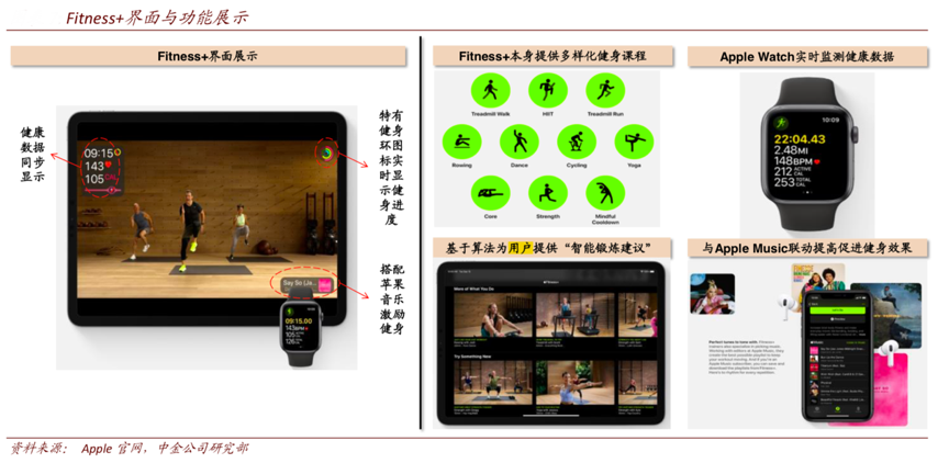 經(jīng)典案例:根據(jù)Apple官網(wǎng)、中金公司研究部等綜合資訊表明,F(xiàn)itness+是蘋果推出的一款軟件服務(wù)功能,以Apple Watch 為接入口與用戶實(shí)現(xiàn)交互,用戶僅需 9.99 美元/月便可訂閱服務(wù)。主要包含以下四項(xiàng)主要功能:健身課程提供:Fitness+應(yīng)用本身提供多樣化的主流應(yīng)用課程,包括 HIIT(高強(qiáng)度間歇訓(xùn)練)、瑜伽、動感單車等十余種課程選擇,滿足用戶的多樣化需求。