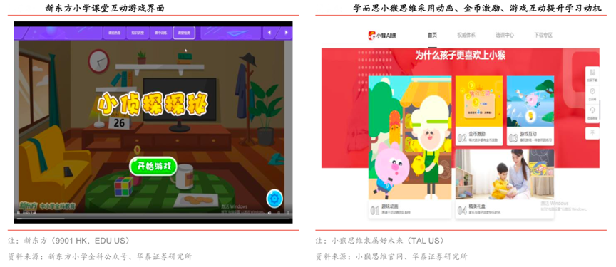 經(jīng)典案例:根據(jù)新東方小學(xué)全科公眾號、小猴思維官網(wǎng)、華泰證券研究所等綜合資訊表明,動力因素方面,在線教培機(jī)構(gòu)廣泛借鑒游戲、視頻直播等互聯(lián)網(wǎng)產(chǎn)品的設(shè)計(jì)來提升學(xué)生的興趣。在視覺效果上應(yīng)用游戲化的 UI 設(shè)計(jì)、IP 人物設(shè)定、動畫、交互式課件、主講教師美顏等手段,提升學(xué)生視覺體驗(yàn)感。在激勵手段上采用升級打怪、學(xué)習(xí)幣、組隊(duì) PK等方式,提高學(xué)生的參與度。