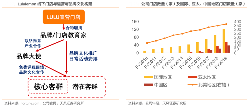 經(jīng)典案例:根據(jù)fortune.com、公司官網(wǎng)、公司年報(bào)、天風(fēng)證券研究所等綜合資訊表明,Lululemon 以線下直營(yíng)門店作為品牌社群區(qū)域中心,通過 Lululemon 獨(dú)有的“品牌教育家” 與 super girls 等目標(biāo)客群建立緊密聯(lián)系,同時(shí)通過 Lululemon 品牌大使宣傳、免費(fèi)瑜伽/ 健身課程回饋、品牌社區(qū)活動(dòng)(events)鞏固并吸納更多潛在客群,實(shí)現(xiàn)以線下門店為中心對(duì)地區(qū)周邊健身客群的有效覆蓋。Lululemon 線下直營(yíng)門店整體規(guī)模 FY2019 末已經(jīng)達(dá)到 491 家。