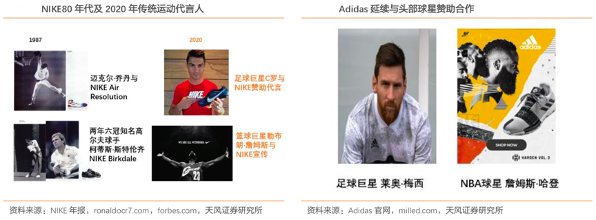 經(jīng)典案例:根據(jù)NILE年報(bào)、ronaldocr7.com、forbes.com、天風(fēng)證券研究所等綜合資訊表明,Lululemon 社群營(yíng)銷以各類在運(yùn)動(dòng)健身、潮流文化具有影響力的意見領(lǐng)袖擔(dān)任品牌形象大使,同時(shí)區(qū)別于傳統(tǒng)扁平化氪金明星代言引流策略:Lululemon 著重評(píng)測(cè)大使候選人與 Lululemon 品牌精神契合度、專業(yè)性、個(gè)人領(lǐng)袖氣質(zhì),NIKE、Adidas 德國(guó)傳統(tǒng)運(yùn)動(dòng)品牌流 量推廣宣傳方面聚焦足球籃球等熱門運(yùn)動(dòng)頭部球星,以期獲得流量及銷售增長(zhǎng)。