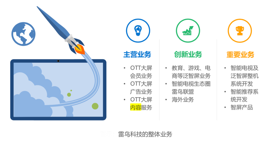 經(jīng)典案例:根據(jù)公司官網(wǎng)、36氪研究院、市場(chǎng)公開(kāi)信息等綜合資訊表明,雷鳥(niǎo)科技創(chuàng)新業(yè)務(wù)以與垂直類(lèi)應(yīng)用合作為主。雷鳥(niǎo)攜手騰訊、愛(ài)奇藝、新東 方和Keep等近百家合作方共建內(nèi)容平臺(tái),為用戶提供各種場(chǎng)景下的大屏服務(wù)。此外,雷鳥(niǎo)科技聯(lián)合視源等20余家品牌成立雷鳥(niǎo)聯(lián)盟,拓展TV、OTT盒 子和智能投影儀等非TCL品牌硬件終端,共同打造智能電視生態(tài)圈。