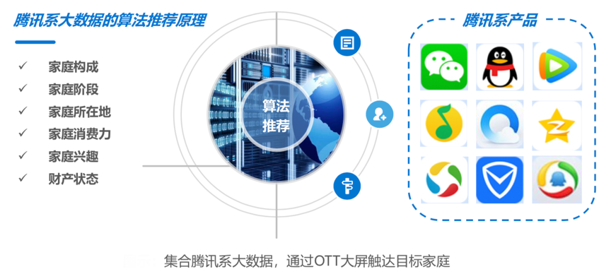 經(jīng)典案例:根據(jù)公司官網(wǎng)、36氪研究院、市場公開信息等綜合資訊表明,騰訊系產(chǎn)品大數(shù)據(jù)網(wǎng)民覆蓋面足夠廣,可從家庭階段、家庭消費(fèi)力、家庭所在地等層面精準(zhǔn)刻畫4億余中國家庭用戶畫像。OTT端的騰訊視頻可以在大數(shù)據(jù)基礎(chǔ)上,利用其算法推薦能力,將內(nèi)容和廣告與目標(biāo)用戶進(jìn)行精準(zhǔn)匹配。