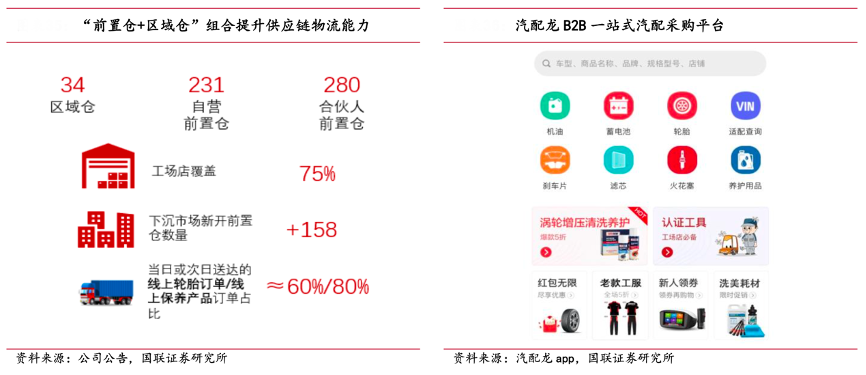 經(jīng)典案例:根據(jù)公司公告、汽配龍app、國聯(lián)證券研究所等綜合資訊表明,途虎前置倉+區(qū)域倉組合滿足即時配送需求,目前全國 75%以上的工場店已被前置倉即時配送服 務(wù)覆蓋。前置倉還協(xié)同公司門店下沉發(fā)展戰(zhàn)略,將更多前置倉下沉至低線城市。“汽配龍”滿足長尾和低頻配件需求、線上系統(tǒng)賦能零配件交易,為途虎工廠店、合作門店及其他終端門店提供即時采購、撮合服務(wù)。截至 2023Q1,汽配龍對接了門店的產(chǎn)品需求、配送中心的采購需求及超 2,200 家外部零配件供應(yīng)商的供應(yīng)能力。