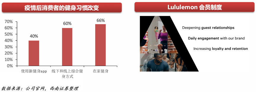 經(jīng)典案例:根據(jù)公司官網(wǎng)、西南證券等綜合資訊表明,Lululemon公司通過Mirror、手機(jī)軟件(app) 和8家全球熱門健身公 司室合作,讓顧客開啟社群、健身、購物一體化體驗(yàn)。根據(jù)大數(shù)據(jù)分析自2020年 以來,有40%的消費(fèi)者在使用新的健身app,60%的消費(fèi)者喜歡線下線上兩者綜合的健身方式,66%的消 費(fèi)者表現(xiàn)更喜歡在家健身,其中使用線上健身app的消費(fèi)者增長了300%。
