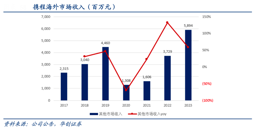 經(jīng)典案例:根據(jù)公司公告、華創(chuàng)證券等綜合資訊表明,攜程公司以“Skyscanner+Trip.com”雙平臺發(fā)展海外業(yè)務(wù),前者定位搜索比價平臺,增長相對穩(wěn)健,2023 年占比總營收預(yù)計 7-8%;后者定位在線旅游預(yù)訂平臺,近年來實(shí)現(xiàn)高速增長,2023 年公 司除大中華地區(qū)的收入為 58.9 億元,同比增長 58.1%。