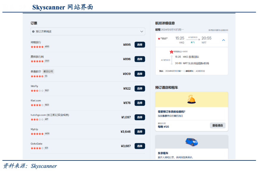 經(jīng)典案例:根據(jù)Skyscanner、華創(chuàng)證券等綜合資訊表明,攜程Skyscanner于2003 年成立,定位機(jī)票比價平臺,2013 年和 2014 年推出租車服務(wù)和酒店 預(yù)訂,2016 年被攜程全資收購,2019 年月活用戶超 1 億,目前已是歐美主流的比價平臺 之一。