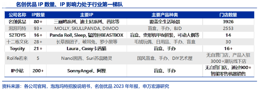 經(jīng)典案例:根據(jù)各公司官網(wǎng)、泡泡瑪特招股說明書、名創(chuàng)優(yōu)品2023年年報、申萬宏源研究等綜合資訊表明,與國內其他潮玩產(chǎn)業(yè)玩家相比,名創(chuàng)優(yōu)品在 IP 數(shù)量及 IP 知名度方面具有較大優(yōu)勢。據(jù)公司官網(wǎng),截至目前,名創(chuàng)優(yōu)品已與超 80 個國內外知名 IP 進行深度合作,同時名創(chuàng)優(yōu)品線下門店規(guī)模優(yōu)勢 顯著,截至 2023 年底國內線下門店數(shù)達 3926 家。