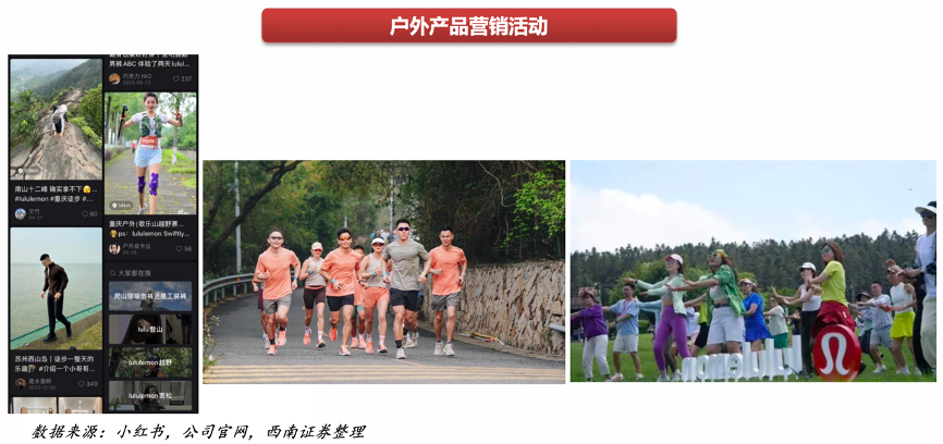 經(jīng)典案例:根據(jù)小紅書、公司官網(wǎng)、西南證券等綜合資訊表明,Lululemon在各大城市積極開展線下戶外興趣活動(dòng),如春日跑、露營(yíng)、燈傘等集群活動(dòng),在忠實(shí)消費(fèi)者嘗試多品類產(chǎn)品的同事擴(kuò)大圈層,吸引其他細(xì)分賽道消費(fèi)者。
