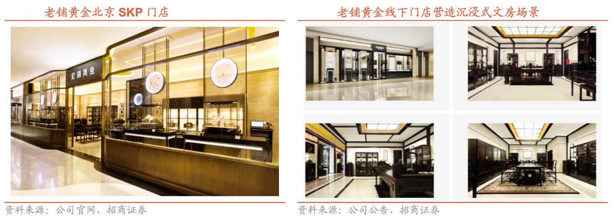 經(jīng)典案例:根據(jù)公司公告、公司官網(wǎng)、招商證券等綜合資訊表明,老鋪黃金在消費場景建設(shè)上,公司探索并建立了古法黃金線下情景化經(jīng)營的新模式,以經(jīng)典、雅致的中國文房場景為主題,從聲、光、嗅等多方面精細(xì)布置,提供沉浸式的傳統(tǒng)經(jīng)典文化意境,并通過優(yōu)質(zhì)的客戶服務(wù),進(jìn)一步打造高端的品牌形象。