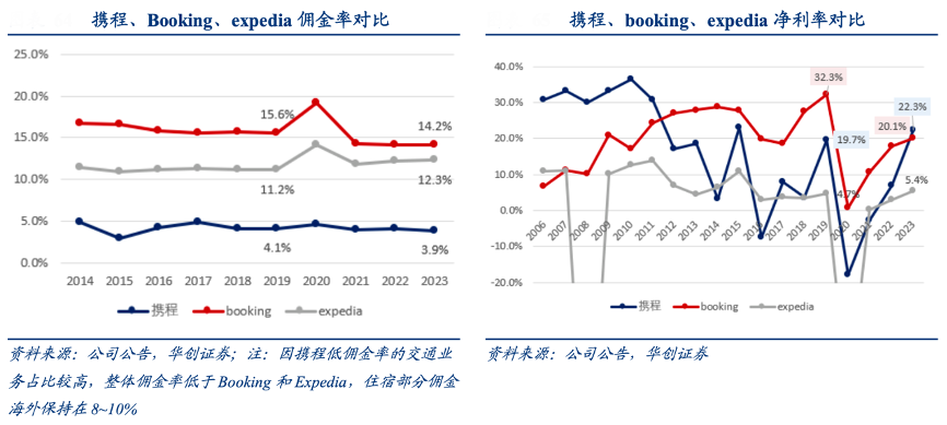 經(jīng)典案例:根據(jù)公司公告、華創(chuàng)證券等綜合資訊表明,基于出境游和 Trip.com 供應(yīng)鏈的打通,依靠攜程在國(guó)內(nèi)已經(jīng)打磨得相對(duì)成熟的產(chǎn)品體系、管理模式,即使在相對(duì)低位的傭金率條件下,2023 年 Trip.com 已實(shí)現(xiàn)自身平臺(tái)邊際收益 層面的盈虧平衡。整體集團(tuán)層面看,2023 年攜程凈利率水平達(dá)到 22.3%,高于 Booking (20.1%)和 Expedia(5.4%)。