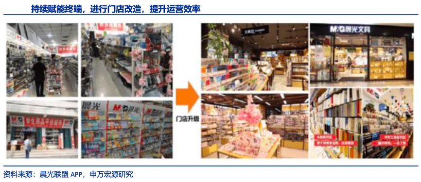 經(jīng)典案例:根據(jù)晨光聯(lián)盟APP、申萬(wàn)宏源研究等綜合資訊表明,晨光股份所有門(mén)店均享有公司統(tǒng)一裝修設(shè)計(jì),以及門(mén)店門(mén)頭標(biāo)有晨光文具品牌字樣,增加品牌露出和 曝光度,持續(xù)提升晨光文具品牌力,同時(shí)其持續(xù)加大對(duì)終端門(mén)店賦能,包括終端產(chǎn)品結(jié)構(gòu)升級(jí)、提高必備品上柜率、增強(qiáng)員工培訓(xùn)、上線信息化系統(tǒng)及晨光聯(lián)盟APP。多維度的賦能支持下,升級(jí)后的門(mén)店能在其他同類(lèi)門(mén)店中快速脫穎而出。
