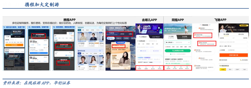 經(jīng)典案例:根據(jù)在線旅游APP、華創(chuàng)證券等綜合資訊表明,2023年攜程私家團(tuán) GMV 同比 2019 年增長(zhǎng) 370%,其中 2-9 人的小團(tuán) GMV 同比 2019 年增長(zhǎng) 100%,國(guó)內(nèi)私家團(tuán)的占比提升了 4 倍(當(dāng)年底占比已提升到 10%), 海外則提升了 1 倍。相比較下,攜程定制游產(chǎn)品相較其他平臺(tái)更為個(gè)性化和人性化,依 托完整的大交通和大住宿的旅游生態(tài)圈,定制產(chǎn)品有更為明顯的優(yōu)勢(shì)。