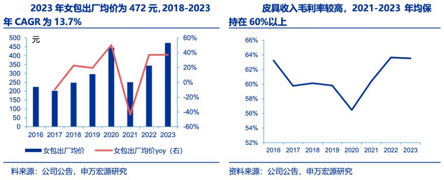 經(jīng)典案例:根據(jù)公司公告、申萬宏源研究等綜合資訊表明,菲安妮積極推新, 2022 年將國潮設(shè)計(jì)融入包袋產(chǎn)品,深耕“巧錦開物”系列,利用獨(dú)家創(chuàng)新織錦工藝推出“煙粉瑤池”“蒼月瑤池”“菱標(biāo)”等新品。通過新品系列,推進(jìn)品牌煥新升級、有效提升客單價(jià)。2023年女包出廠均價(jià)為 472 元,同比提升 37.3%,2018-2023 年 CAGR 為 13.7%。