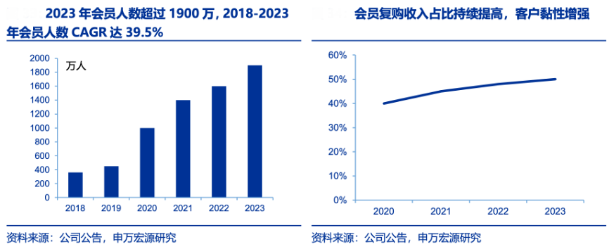 經(jīng)典案例:根據(jù)公司公告、申萬(wàn)宏源研究等綜合資訊表明,潮宏基公司深耕用戶數(shù)據(jù)化管理、公私域流量聯(lián)動(dòng)、用戶場(chǎng)景化運(yùn)營(yíng),原創(chuàng)國(guó)潮設(shè)計(jì)作品吸引更多年輕消費(fèi)者成為公司忠實(shí)客戶,形成差異化競(jìng)爭(zhēng)力。2023 年會(huì)員人數(shù)超過 1900 萬(wàn),2018-2023 年會(huì)員人數(shù) CAGR 達(dá) 39.5%,同時(shí)會(huì)員復(fù)購(gòu)收入占比也由 2020 年的 40%增長(zhǎng)到了 2023 年的 50%。