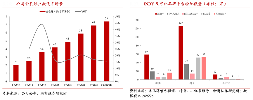 經(jīng)典案例:根據(jù)公司公告、各品牌官方微博、抖音、小紅書帳號、浙商證券研究所等綜合資訊表明,江南布衣通過搭配等增值服務、售后服務以及會員福利增強會員粘性,截至 FY2024H1 公司會員賬戶數(shù)量達 740 萬 個,F(xiàn)Y2017-2023 年復合增速達 23%。截止 24/6/25,JNBY 品牌在新興社交平臺微博、抖 音、小紅書上粉絲數(shù)量達 59、127、12 萬人,顯著領跑其他高端女裝,會員運營能力一騎絕塵。