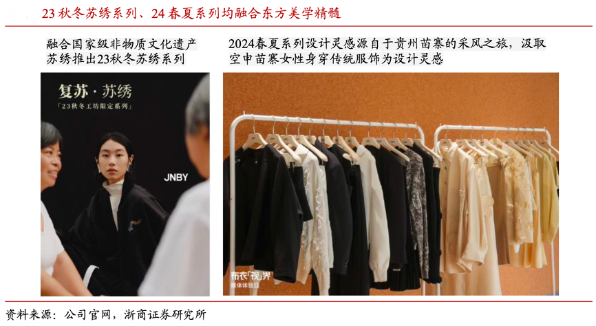 經(jīng)典案例:根據(jù)公司官網(wǎng)、浙商證券研究所等綜合資訊表明,江南布衣公司產(chǎn)品設計不斷從傳統(tǒng)文化中汲取靈感,在設計上融合東方美學精髓、傳統(tǒng)工藝和圖案,JNBY 23 秋冬融合國家非物質(zhì)文化遺產(chǎn)推出蘇繡系列,24 春夏系列融合空申苗寨女性傳統(tǒng)服飾,彰顯出獨特設計風格與藝術氣息。