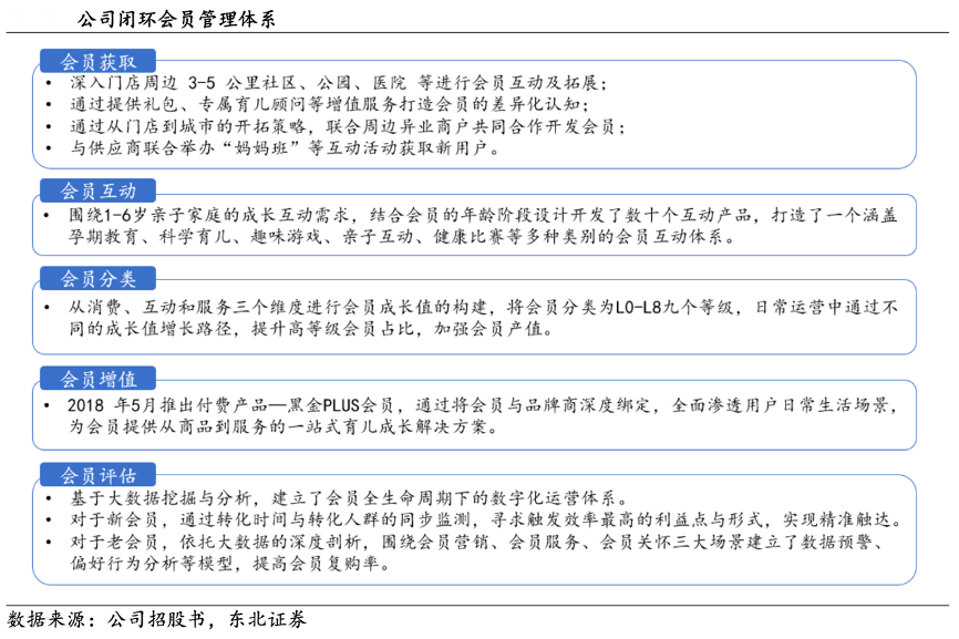 經(jīng)典案例:根據(jù)公司招股書、東北證券等綜合資訊表明,孩子王公司建立以會(huì)員制度為基礎(chǔ)的單客經(jīng)營模式,從互動(dòng)到產(chǎn)生情感黏性,再到成為高產(chǎn)值會(huì)員,最后高產(chǎn)值會(huì)員帶動(dòng)潛在會(huì)員,一整套會(huì)員獲取和管理模式高度有效,經(jīng)過多年發(fā)展,公司會(huì)員人數(shù)快速提升,截至 2022 年末,會(huì)員人數(shù)超 6000 萬人, 2022 年會(huì)員貢獻(xiàn)收入占公司全部母嬰商品銷售收入的 96%以上。