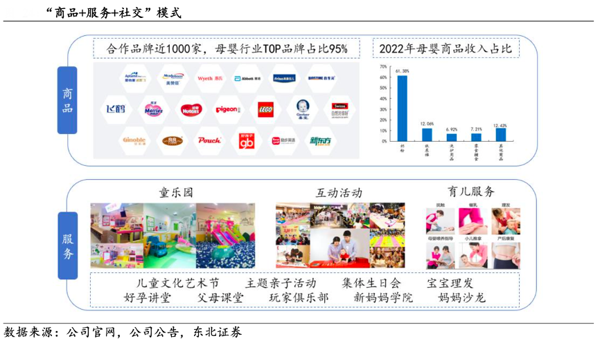 經(jīng)典案例:根據(jù)公司官網(wǎng)、公司公告、東北證券等綜合資訊表明,相對(duì)于其他線上平臺(tái),孩子王平臺(tái)精準(zhǔn)對(duì)焦母嬰群體,縮短商戶與目標(biāo)客群的接觸距離,提高商戶的廣告投入產(chǎn)出效果,入駐商家有望逐漸提升。C端方面,主要開(kāi)展涵蓋童樂(lè)園、互動(dòng)活動(dòng)和育兒服務(wù)的母嬰服務(wù),豐富的社交活動(dòng)將不斷吸引更多母嬰客戶加入。