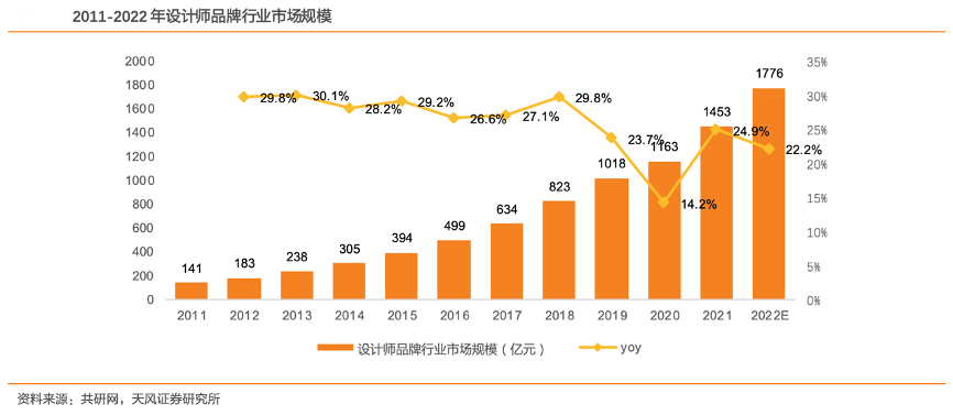 經(jīng)典案例:根據(jù)共研網(wǎng)、天風(fēng)證券研究所等綜合資訊表明,隨著我國創(chuàng)意產(chǎn)業(yè)持續(xù)發(fā)展,人均可支配收入不斷增長,更多的人不再滿足傳統(tǒng)標(biāo)準(zhǔn)化的服裝,而渴望選擇個(gè)性化的服裝穿戴。共研網(wǎng)數(shù)據(jù)顯示,2011-2021 年設(shè)計(jì)師品牌行 業(yè)市場規(guī)模由 141 億元擴(kuò)大至 1453 億元,CAGR26.27%。