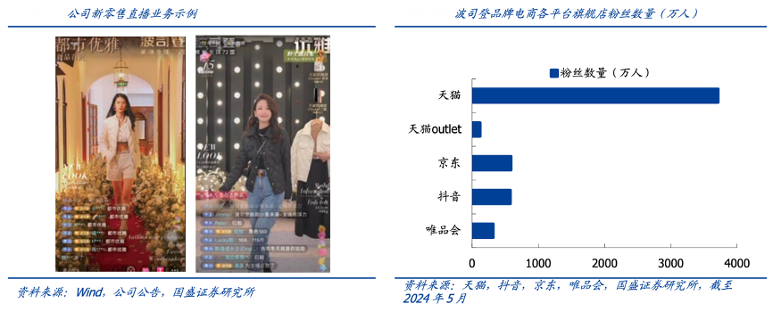 經(jīng)典案例:根據(jù)wind、公司公告、天貓、抖音、京東、唯品會(huì)、國(guó)盛證券研究所等綜合資訊表明,目前波司登公司電商已經(jīng)形成全面的平臺(tái)布局:天貓、京東、唯品會(huì)、抖音等多平臺(tái)全 面覆蓋,傳統(tǒng)電商、直播電商多點(diǎn)開花。據(jù)各平臺(tái)數(shù)據(jù),截至 2024 年 5 月主品牌 波司登在天貓/京東/抖音/唯品會(huì)平臺(tái)旗艦店鋪粉絲數(shù)量分別為 3714/588/577/318 萬(wàn)人,過(guò)去持續(xù)增長(zhǎng)。
