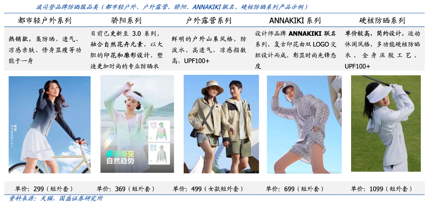 經(jīng)典案例:根據(jù)天貓、國(guó)盛證券研究所等綜合資訊表明,波司登推出款式新穎豐富、專業(yè)性能優(yōu)越的產(chǎn)品,獲得消費(fèi)市場(chǎng)歡迎。據(jù)祈飛數(shù)據(jù)及公司官網(wǎng),波司登 2023 年在天貓平臺(tái)防曬服類目銷售額排名第 8 位/在中高端防曬服市場(chǎng)位列龍頭位置,目前在中高端防曬服消費(fèi)市場(chǎng)已經(jīng)形成較好的口碑。