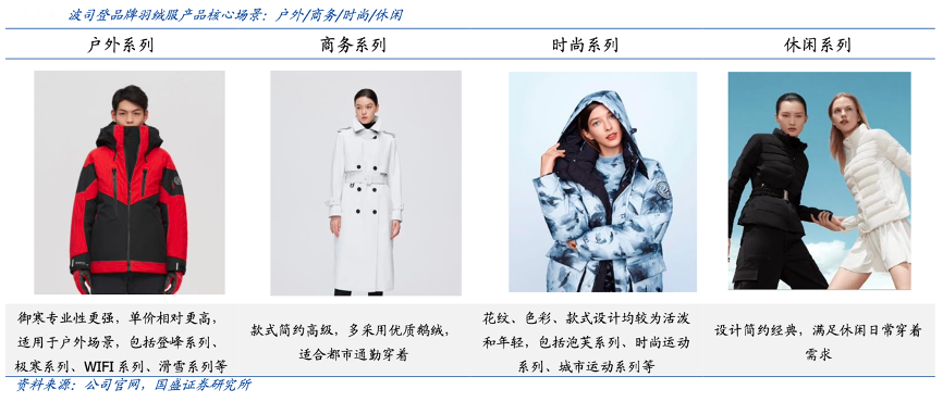 經(jīng)典案例:根據(jù)公司官網(wǎng)、國盛證券研究所等綜合資訊表明,作為羽絨服品類龍頭品牌,波司登公司主品牌圍繞不同的穿著場景(商務(wù)、戶外、時尚、休閑)、不同人群需求特征,持續(xù)迭代推出豐富的產(chǎn)品,包括戶外場景下的極寒系列、滑雪系列,時尚場景下的泡芙系列、時尚運動系列,商務(wù)場景下的風衣羽絨服系列等。