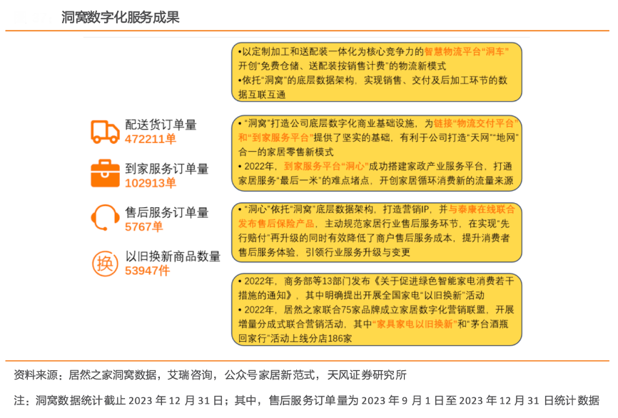經(jīng)典案例:根據(jù)公司年報、天風(fēng)證券研究所等綜合資訊表明,2000年居然之家公司率先提出“先行賠付”的服務(wù)理念,后續(xù)依次推出“綠色環(huán)保”、“一個月內(nèi)無理由退換貨”、“裝修 零增項 ”、“終 身維保 ”等一系列服務(wù)承諾; 2023 年圍繞“家具家電以舊換新”、“家有困難找居然”、“舊房換新顏”三大營 銷 IP,為消費者提供更多可選權(quán)益方案。