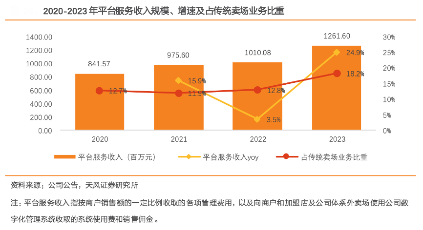 經(jīng)典案例:根據(jù)公司公告、天風(fēng)證券研究所等綜合資訊表明,居然之家公司率先在家居行業(yè)內(nèi)開(kāi)展數(shù)字化轉(zhuǎn)型,已完成“洞窩”、“居然設(shè)計(jì)家”和“居然智慧家”三大家居產(chǎn)業(yè)數(shù)智化平臺(tái)的建設(shè),共同推進(jìn)公司成為實(shí)體商業(yè)數(shù)智化轉(zhuǎn)型升級(jí)樣板戰(zhàn)略目標(biāo)的實(shí)現(xiàn)。2020-2023 年公司平臺(tái)服務(wù)收入從 8.4 億 元提升至 12.6 億元,CAGR 為 14.4%,且在傳統(tǒng)賣場(chǎng)業(yè)務(wù)中占比持續(xù)提升。