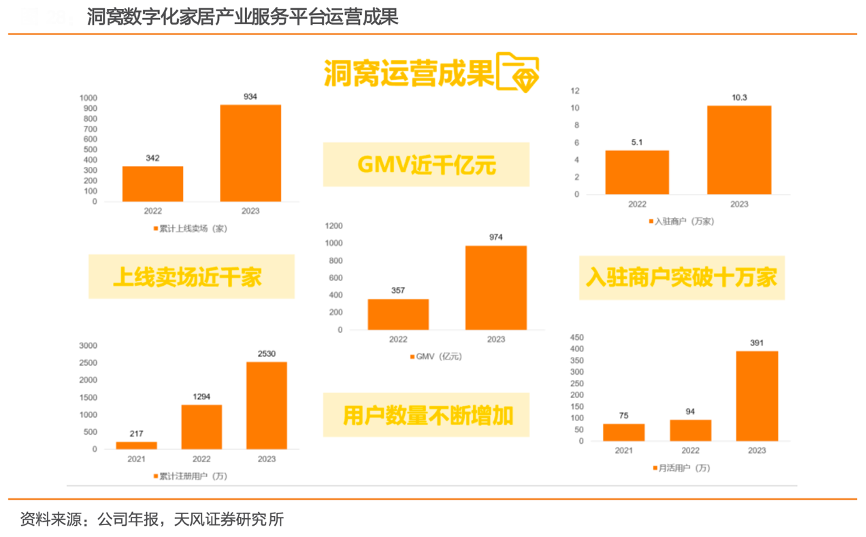 經(jīng)典案例:根據(jù)公司年報(bào)、天風(fēng)證券研究所等綜合資訊表明,洞窩是家裝家居數(shù)字化產(chǎn)業(yè)服務(wù)平臺(tái)。成立于2020 年12月,依托居然之家的產(chǎn)業(yè)背景 和平臺(tái)資 源打造 ,通過(guò) 聚焦產(chǎn) 業(yè)鏈上 下游的 數(shù)字化 賦能、線 上線下 一體化 全場(chǎng)景 零售、 跨 境電商三大核心業(yè)務(wù),全鏈路賦能品 牌工廠 、經(jīng)銷 商和賣 場(chǎng)。截至 2023 年底洞窩累計(jì)上線賣場(chǎng)已達(dá) 934 家,同比增長(zhǎng) 173.1%;入駐商戶超過(guò) 10 萬(wàn)家, 同比增長(zhǎng) 101.33%。