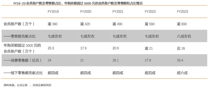 經(jīng)典案例:根據(jù)公司公告、天風證券研究所等綜合資訊表明,江南布衣精心設計的會員制度提升了消費者體驗,為品牌提供深入的市場洞察,指導產(chǎn)品迭代,促進社群建設,更好傳達品牌價值觀。FY19-23,公司會員賬戶數(shù)由逾 360 萬個 增長到逾 690 萬個,零售額貢獻占比增長至八成左右;年購買額超過 5000 元的會員賬戶 數(shù)由 20.3 萬個增長到近 26 萬個。