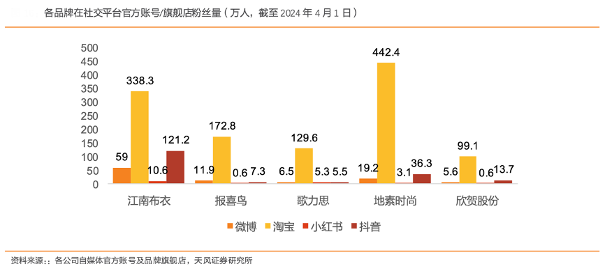 經(jīng)典案例:根據(jù)各公司自媒體官方帳號及品牌旗艦店、天風證券研究所等綜合資訊表明,江南布衣公司持續(xù)優(yōu)化以粉絲為核心的全域零售網(wǎng)絡的建設,公司 各大社交平臺官方賬號和旗艦店粉絲數(shù)都在同業(yè)企業(yè)中位居前茅。截至 2024 年上半年財年,江南布衣在各大社 交平臺上的粉絲量累計超過 850 萬。