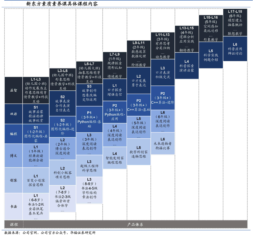 經(jīng)典案例:根據(jù)公司官網(wǎng)、公司官方公眾號(hào)、華福證券研究會(huì)等綜合資訊表明,素質(zhì)教育是新東方公司原小學(xué)學(xué)科培訓(xùn)的核心轉(zhuǎn)型方向。集團(tuán)課程產(chǎn) 品體系完善,針對(duì)不同學(xué)齡的兒童設(shè)立不同的教學(xué)內(nèi)容和方式,以適應(yīng)不同發(fā)展階 段的學(xué)習(xí)需求。例如,在益智課程中,根據(jù)學(xué)生年級(jí)不同設(shè)置了 18 個(gè)等級(jí)。對(duì)于幼 兒園小班的學(xué)生,采用情景教學(xué)和科技互動(dòng)的方式培養(yǎng)孩子的形象思維。