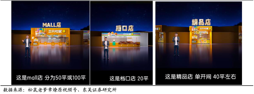 經(jīng)典案例:根據(jù)松鼠老爹章燎原視頻號、東吳證券研究所等綜合資訊表明,三只松鼠多店型推出務(wù)求快速擴(kuò)張密度布局。公司推出店型矩陣,適配不同社區(qū)商圈,不同店型以現(xiàn)制炒貨和差異化零食產(chǎn)品結(jié)構(gòu)滿足不同需求。包括旗艦店(120-150平)、標(biāo)準(zhǔn) 店(80-100平)、精品店(40平左右)、mall 店(50 平或 100 平)、檔口店(20 平)。
