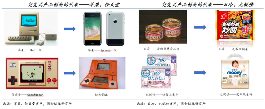 經(jīng)典案例:根據(jù)任天堂官網(wǎng)、蘋果、日冷、尤妮佳官網(wǎng)、國金證券研究所等綜合資訊表明,卓越的公司在舊的產(chǎn)品生命力進(jìn)入中后期后,有能力通過下一個(gè)重大突變式創(chuàng)新,為公司的增長打開新的引擎。比如:蘋果推出 iPhone、任天堂推出 DS、尤妮佳進(jìn)軍紙尿褲市場推出“Moony”品牌、日冷推出“正宗炒飯”。