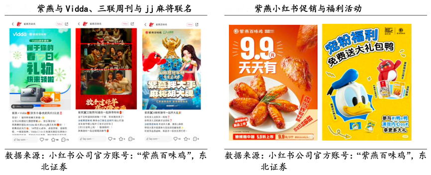 經(jīng)典案例:根據(jù)小紅書(shū)公司官方帳號(hào):“紫燕百味雞”、東北證券等綜合資訊表明,紫燕食品公司在社交媒體營(yíng)銷(xiāo)方面逐漸成熟且有著絕對(duì)的領(lǐng)先,而年輕群體在社交媒體用戶占多數(shù),有助于公司在該群體打開(kāi)知名度,穩(wěn)定未來(lái)客源。 為了進(jìn)一步推動(dòng)品牌宣傳,公司與 Vidda、jj 麻將、三聯(lián)周刊等第三方品牌聯(lián)名合作,同時(shí)參與直播賣(mài)貨,在線上平臺(tái)進(jìn)行各大促銷(xiāo)與福利活動(dòng)。