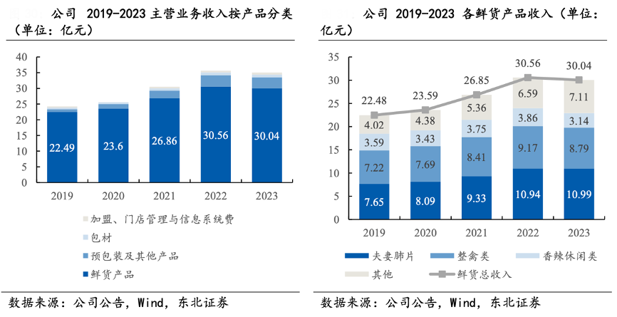 經(jīng)典案例:根據(jù)公司公告、wind、東北證券等綜合資訊表明,紫燕食品公司以塑造“大單品”與“爆品”為目標(biāo),推出多種新品,如:酸湯肥牛、冷吃千層肚、樂(lè)山缽缽雞、藤椒板鴨等。鮮貨產(chǎn)品的 2019/2020/2021/2022/2023 年的營(yíng)業(yè)收入為 22.49/23.60/26.86/30.56/ 30.04 億 元,CAGR 為+7.52%,由 22.49 億元漲至 30.04 億元,上漲幅度基本與公司主營(yíng)收入 呈正比。