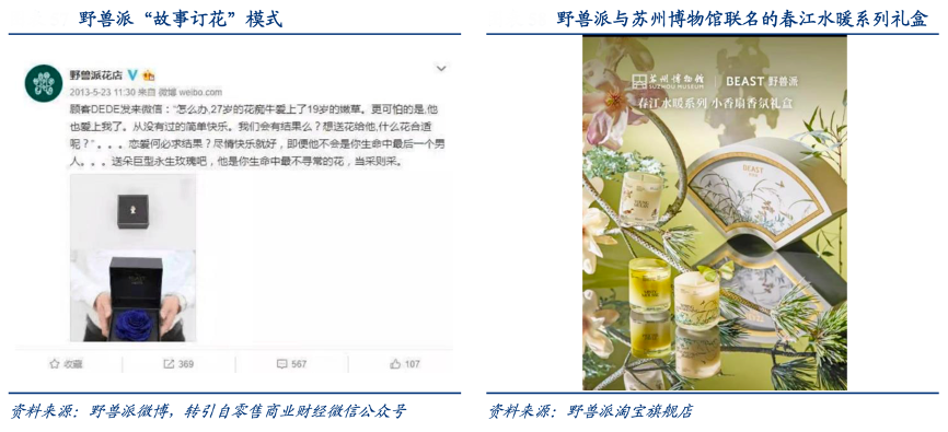經(jīng)典案例:根據(jù)野獸派微博、轉(zhuǎn)引自零售商業(yè)財經(jīng)微信公眾號、野獸派淘寶旗艦店、華創(chuàng)證券等綜合資訊表明,野獸派 2011 年底誕生于微博,早期以賣花為主營,“故事訂花”模式(根據(jù)網(wǎng)友私信所 講述的故事來定制不同的花束,并賦予浪漫命名,為訂花者量身打造專屬產(chǎn)品) 售賣產(chǎn) 品之余,提供更多情緒價值,讓消費者心甘情愿為高溢價買單。