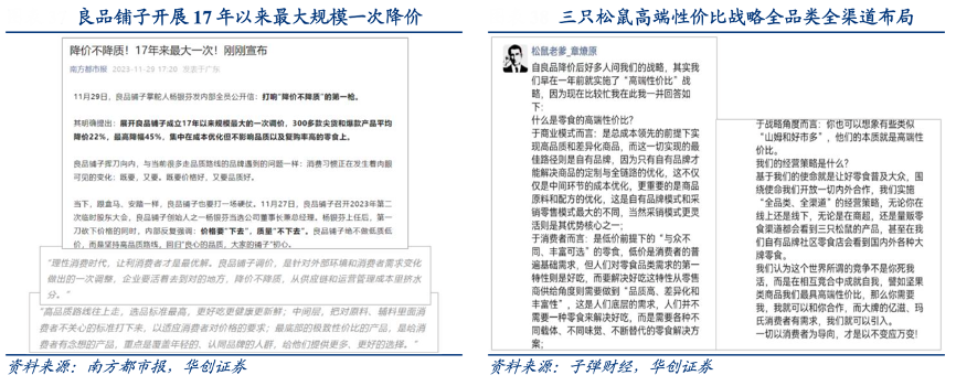經(jīng)典案例:根據(jù)南方都市報(bào)、子彈財(cái)經(jīng)、華創(chuàng)證券等綜合資訊表明,零食量販催生的新一輪供應(yīng)鏈革命,從下游延伸至上游,過去零食電商時(shí)代積累品牌高度,當(dāng)前從白牌到自建產(chǎn)能優(yōu)化供應(yīng)鏈,放大制造效率和性價(jià)比優(yōu)勢(shì)。以良品降價(jià)為標(biāo)志,松鼠布局高端性價(jià)比、百草味強(qiáng)化“品價(jià)比”,零食全渠道開始問供應(yīng)鏈拿效率,當(dāng)前也在積極的折扣化摸索中。