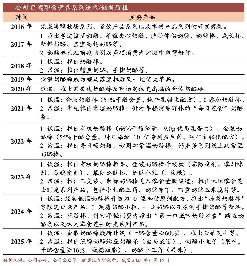 經(jīng)典案例:根據(jù)公司公告、公司公眾號、財通證券研究所等綜合資訊表明,妙可藍(lán)多公司依托業(yè)內(nèi)領(lǐng)先的研發(fā)能力,實現(xiàn)奶酪產(chǎn)品的持續(xù)迭代升級。自 2018 年低溫奶酪棒上市以來,公司針對奶酪棒的口味、營養(yǎng)、干酪含量等各維度不斷迭代升級,陸續(xù)推出了零添加金裝奶酪棒、高鈣奶酪棒、奇炫奶酪棒等升級品類,并于 2021 年推出常溫奶酪棒,拓寬了奶酪棒產(chǎn)品的渠道和消費(fèi)場景。