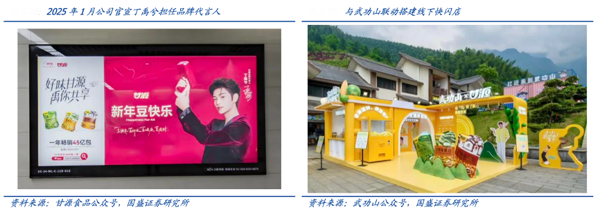 經(jīng)典案例:根據(jù)甘源食品公眾號(hào)、武功山公眾號(hào)、國盛證券研究所等綜合資訊表明,2025年1月甘源公司官宣丁禹兮擔(dān)任品牌代言人,春節(jié)期間定制代言人禮盒,搭配贈(zèng)送明星獨(dú)家周邊。同時(shí)開展一系列品宣活動(dòng),線下聯(lián)合老婆 大人打造定制陳列,組織主題門店打卡活動(dòng)。此外借助萍鄉(xiāng)旅游優(yōu)勢(shì),與武功山聯(lián)名搭建線下快閃店,打卡贈(zèng)送冰激凌,并沿線投放宣傳物料,實(shí)現(xiàn)吃喝玩樂巧妙互動(dòng)。
